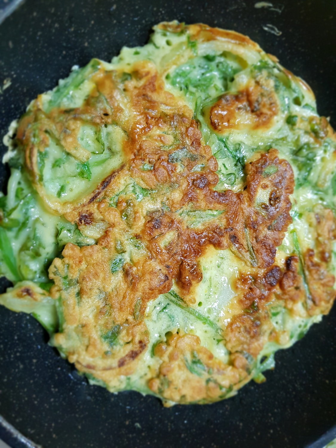 준비된 반죽을 국자나 숟가락으로 떠서 달궈진 팬에 얇게 펴줍니다. 쑥갓이 너무 뭉치지 않도록 고르게 펴주는 것이 중요합니다. 한쪽 면이 노릇하게 익기 시작하면 가장자리가 바삭해 보일 거예요.