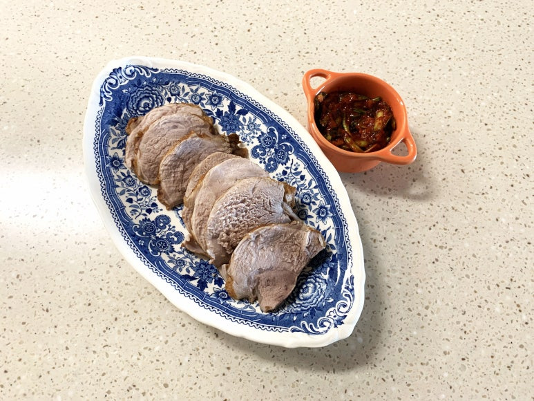 먹음직스럽게 썬 수육을 접시에 보기 좋게 담아냅니다. 곁들여 먹을 양념장으로는 특별히 준비한 부추 양념장을 추천합니다. 이전에 만들었던 바로 그 부추 양념장으로, 순댓국이나 모둠 순대와 함께 먹어도 환상적인 맛을 자랑했죠! 신선한 부추에 고춧가루, 새우젓, 갈치액젓 등을 넣어 감칠맛을 더한 양념장은 오향 수육의 풍미를 한층 끌어올려 줄 것입니다. 취향에 따라 찍어 드시거나, 수육 위에 얹어 함께 즐겨보세요.
