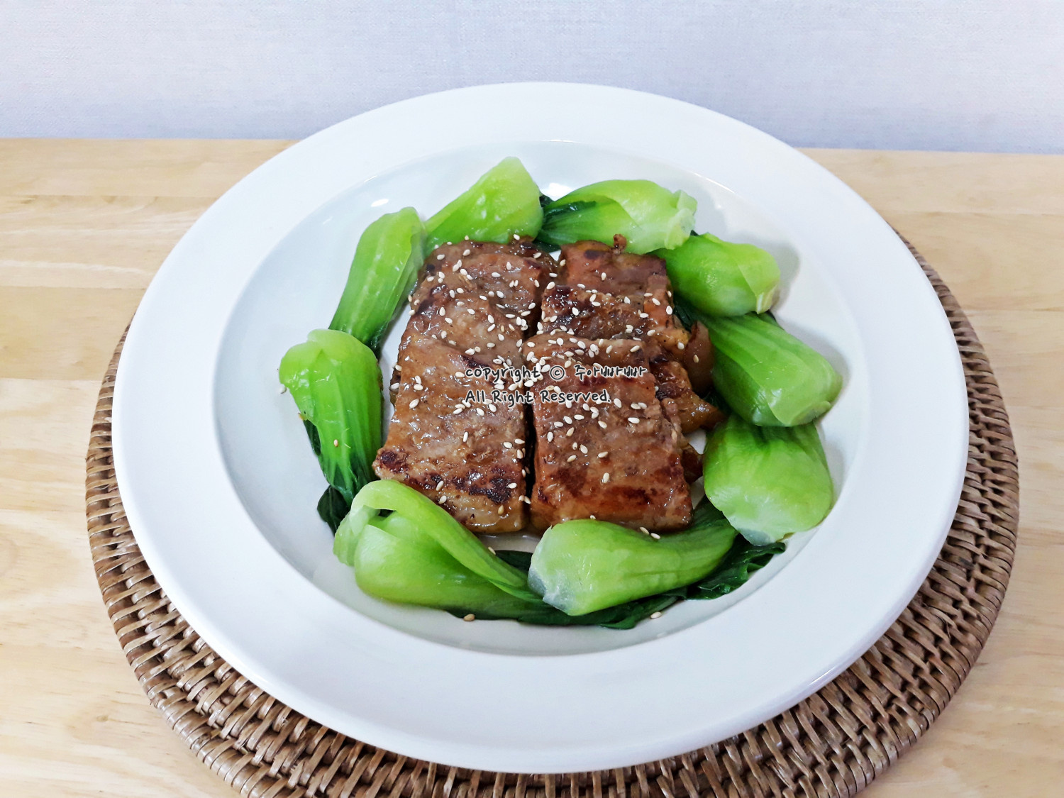 잘 데쳐진 청경채는 찬물에 한번 헹궈 색감을 살려주고, 물기를 제거한 뒤 먹음직스럽게 접시에 보기 좋게 담아냅니다. 동파육과 함께 곁들이면 색감도 예쁘고 맛의 균형도 잘 맞습니다.