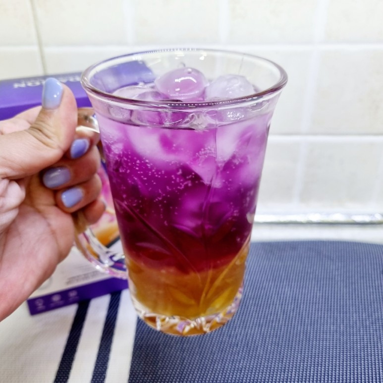 이 상태에서 만들어둔 그라데이션 용액을 부어주면, 잔 아래쪽에는 노란 유자청이 보이고 위쪽으로는 신비로운 보라색 에이드 층이 생기면서 아름다운 유자 에이드가 완성됩니다! 색의 대비가 정말 예쁘죠? 보기만 해도 기분이 좋아지는 홈카페 음료를 즐겨보세요.