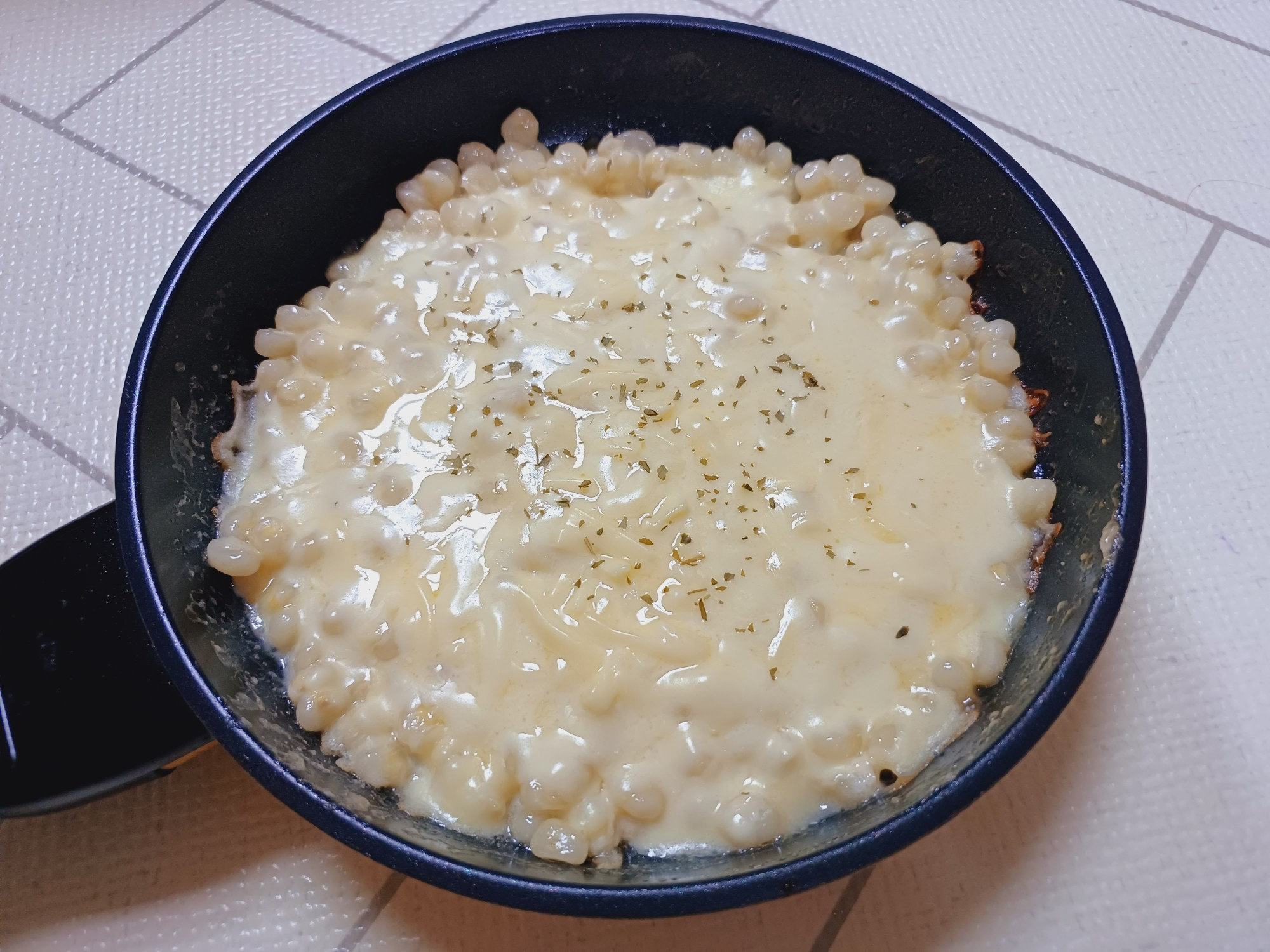 볶아진 옥수수를 팬에 평평하게 잘 펼쳐준 다음, 그 위에 먹음직스러운 피자치즈를 취향껏 듬뿍 올려주세요. 치즈를 좋아하시면 더 많이, 적당히만 넣고 싶으시면 사진처럼 적당량만 올려주시면 됩니다.