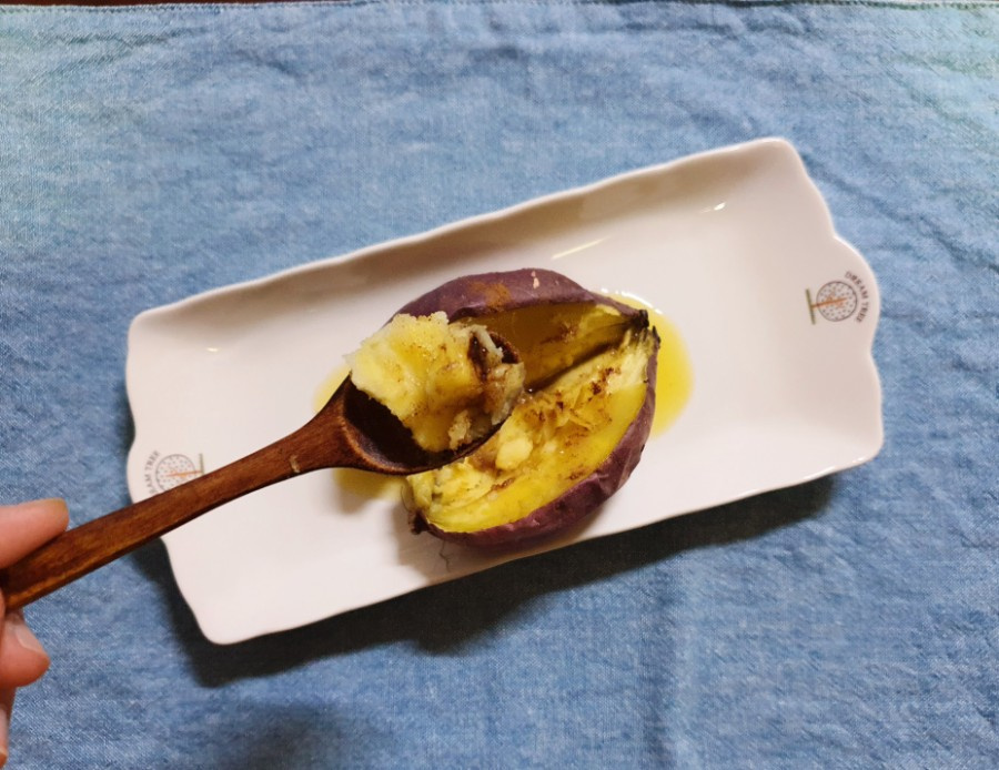 방금 갈라놓은 고구마의 벌어진 틈 사이로 차가운 버터 한 조각을 쏙 넣어주세요. 고구마의 뜨거운 열기에 버터가 서서히 녹아들어 고구마와 환상적인 조화를 이룰 거예요.