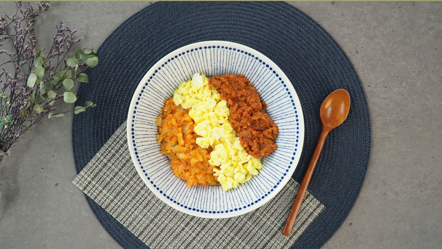 이제 예쁜 그릇에 따뜻한 밥을 보기 좋게 담아줍니다. 그 위에 준비해둔 맛있는 고기볶음장을 넉넉하게 올리고, 만들어둔 포슬포슬한 스크램블 에그와 먹음직스럽게 볶아진 김치를 보기 좋게 올려주면 세상 맛있는 소보로 덮밥 완성입니다! 숟가락으로 밥과 모든 고명을 슥슥 비벼 맛있게 즐기세요.