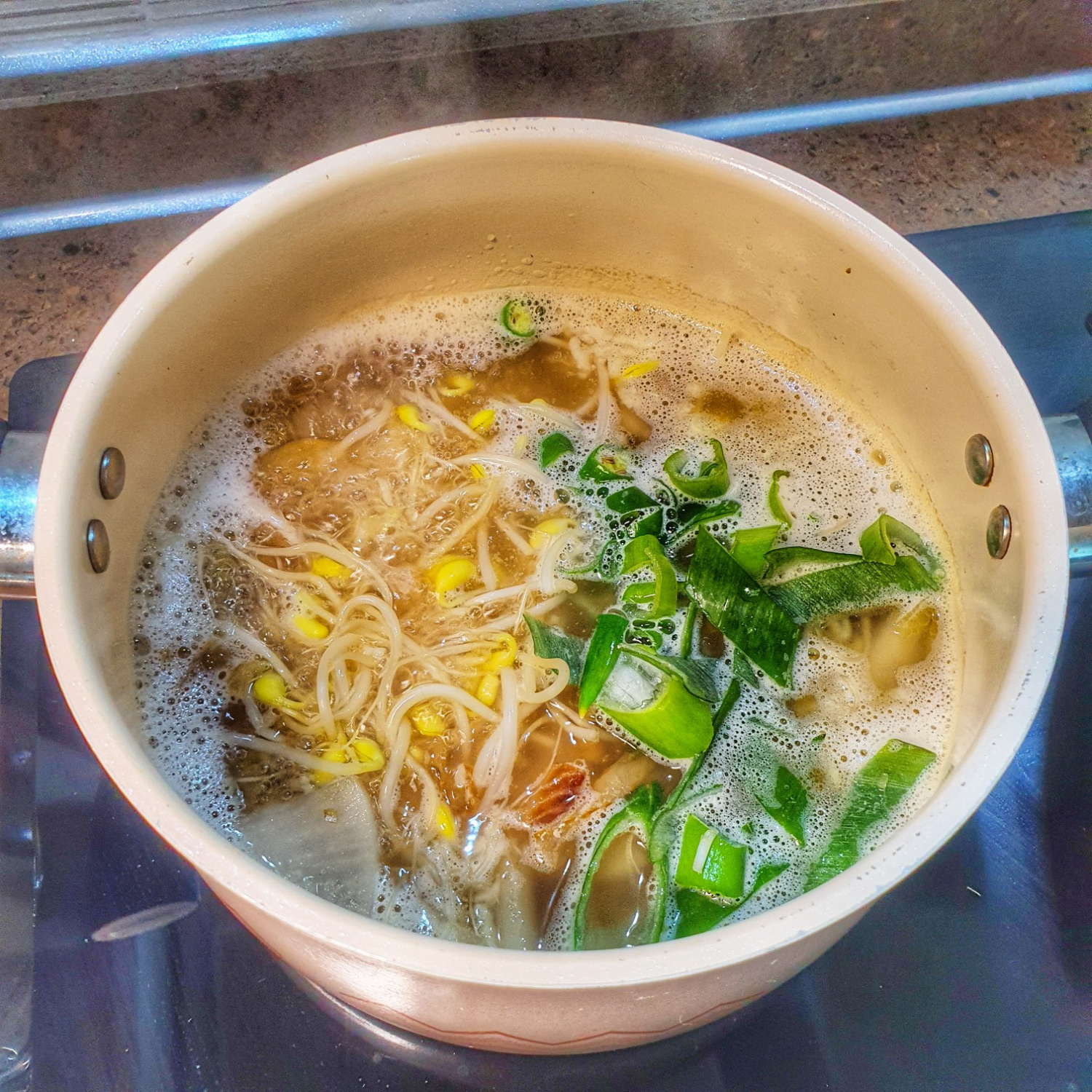 국물이 한소끔 끓어오르면, 무가 완전히 익었는지 확인합니다. 무가 익었으면 남은 쌀뜨물을 모두 붓고 다시 한번 센 불에서 끓여줍니다. 국물이 팔팔 끓어오르면 씻어둔 콩나물을 넣고, 뚜껑을 덮지 않은 상태에서 다시 한번 끓여줍니다. 콩나물이 익으면서 시원한 맛을 더해 줄 거예요. (Tip: 콩나물을 넣은 후에는 뚜껑을 닫지 않아야 비린내가 나지 않고 아삭한 식감을 살릴 수 있습니다.)