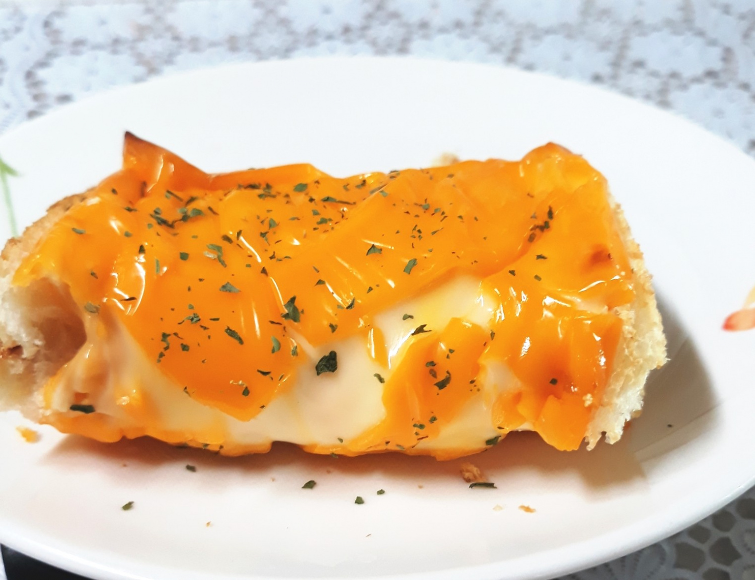 Finally, sprinkle a pinch of dried parsley flakes over the melted cheese for a touch of color and extra aroma. Fold the garlic bread in half while it’s still warm. Your incredibly delicious 3-Layer Kaya Cheese Garlic Bread, with its perfect blend of crispy bread and gooey, flavorful cheese, is now ready to be enjoyed!