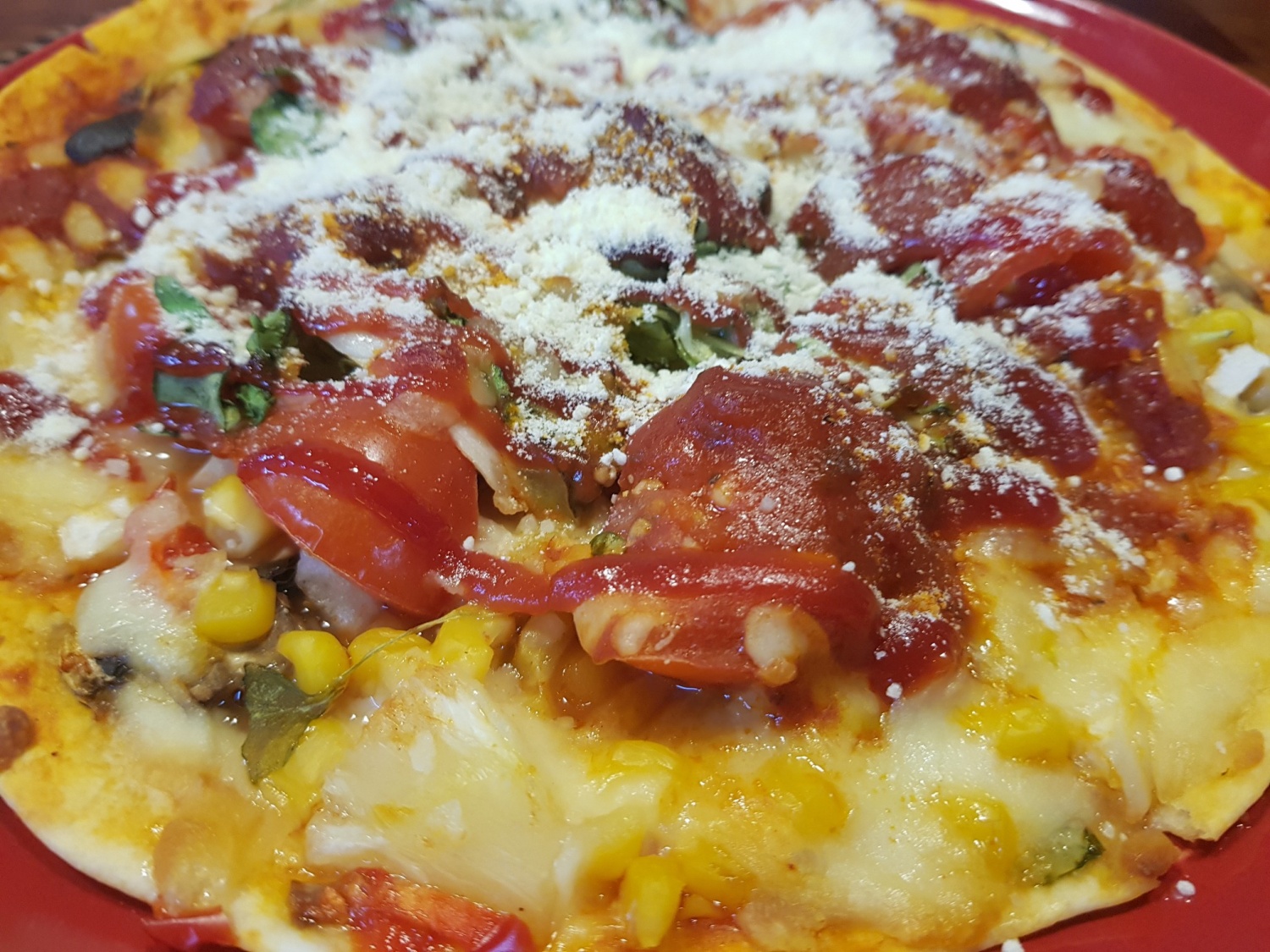 Now, transfer all the pizzas onto a baking sheet. Bake in a preheated oven at 180°C (350°F) for about 10 minutes, or until the cheese is golden brown and the tortilla is crispy. Enjoy your delicious homemade pizzas! (If you don’t have an oven, you can also cook them in a frying pan over low heat with a lid on.) For an extra touch of flavor, sprinkle some leftover Parmesan cheese powder on top, just like from a pizza place. Enjoy the special pizzas you made with your whole family!