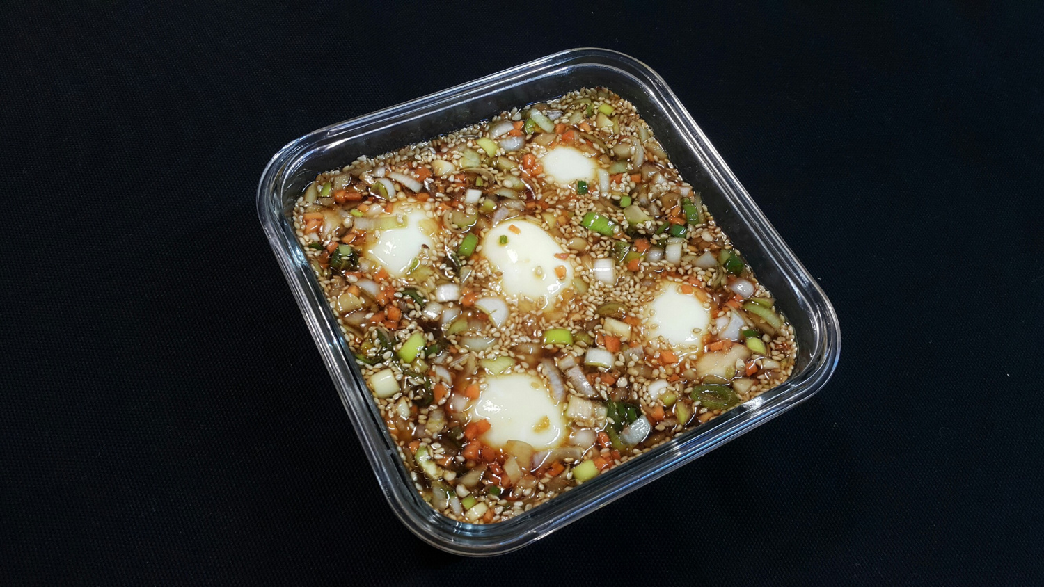 Pour in 2 Tbsp of sesame oil for a rich, nutty aroma. The fragrant sesame oil will make the marinated eggs even more delicious.