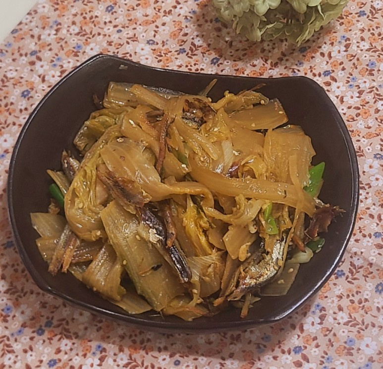 Arrange the soaked anchovies in the center of the sautéed kimchi. The anchovies will absorb the kimchi broth, becoming tender and flavorful.