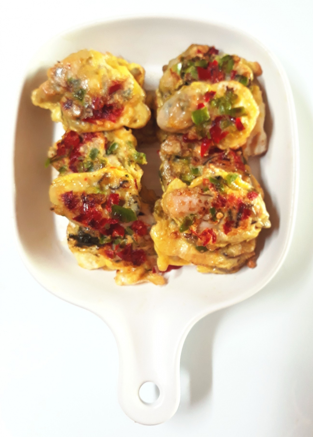 Heat a generous amount of cooking oil in a pan over medium-low heat. Carefully place the egg-coated oysters into the hot pan, one by one. Top each oyster with the minced red and green peppers. Gently press down on the oysters with a spatula or chopstick while frying. Cook for about 15 seconds on each side until golden brown and crispy on the outside, while remaining tender inside. Avoid overcooking to maintain the oysters’ tenderness.