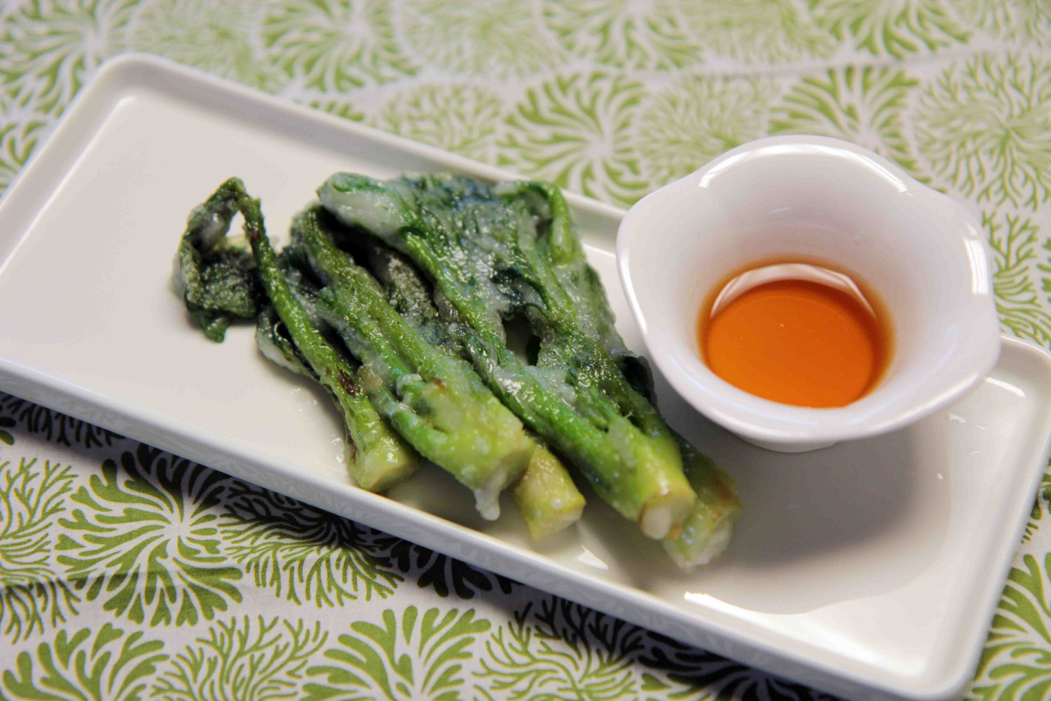 Coat the blanched and drained aralia shoots evenly with the glutinous rice batter. Ensure each shoot is lightly and fully covered. This coating will create a wonderfully chewy texture when cooked.