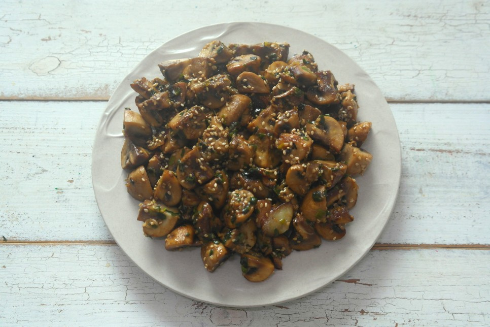 Once all the ingredients are well combined and beautifully sautéed, sprinkle 1 tablespoon of toasted sesame seeds over the top for a final flourish. Your delicious butter-sautéed mushrooms are ready! Enjoy them warm for the best experience. 🍻