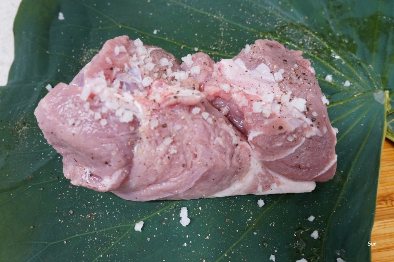 Once the pork has been thoroughly drained of blood, prepare it. Now, wash the fresh lotus leaves thoroughly under running water and pat them dry. Spread them out, place the blood-removed pork on top, and lightly season with salt and pepper. This step will allow the subtle aroma of the lotus leaves to gently permeate the meat.