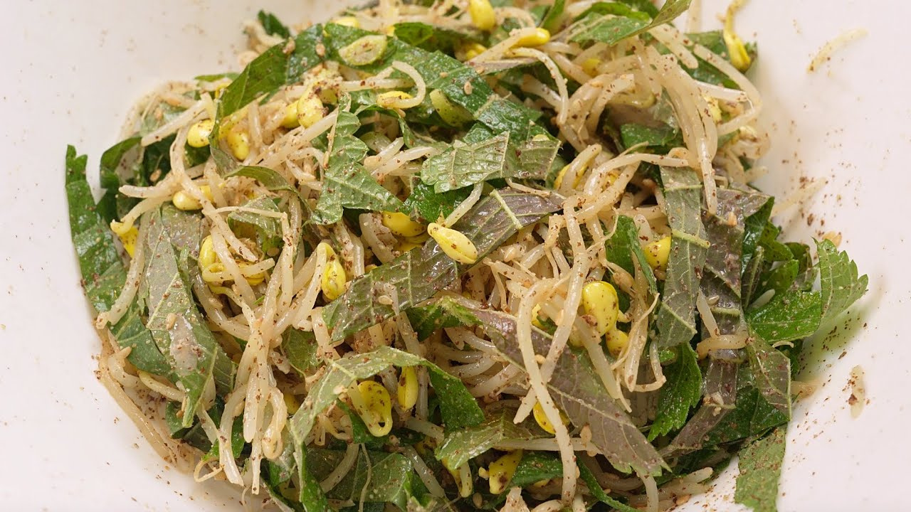 A fragrant and delicious bean sprout salad enhanced with perilla leaves and perilla seed powder!