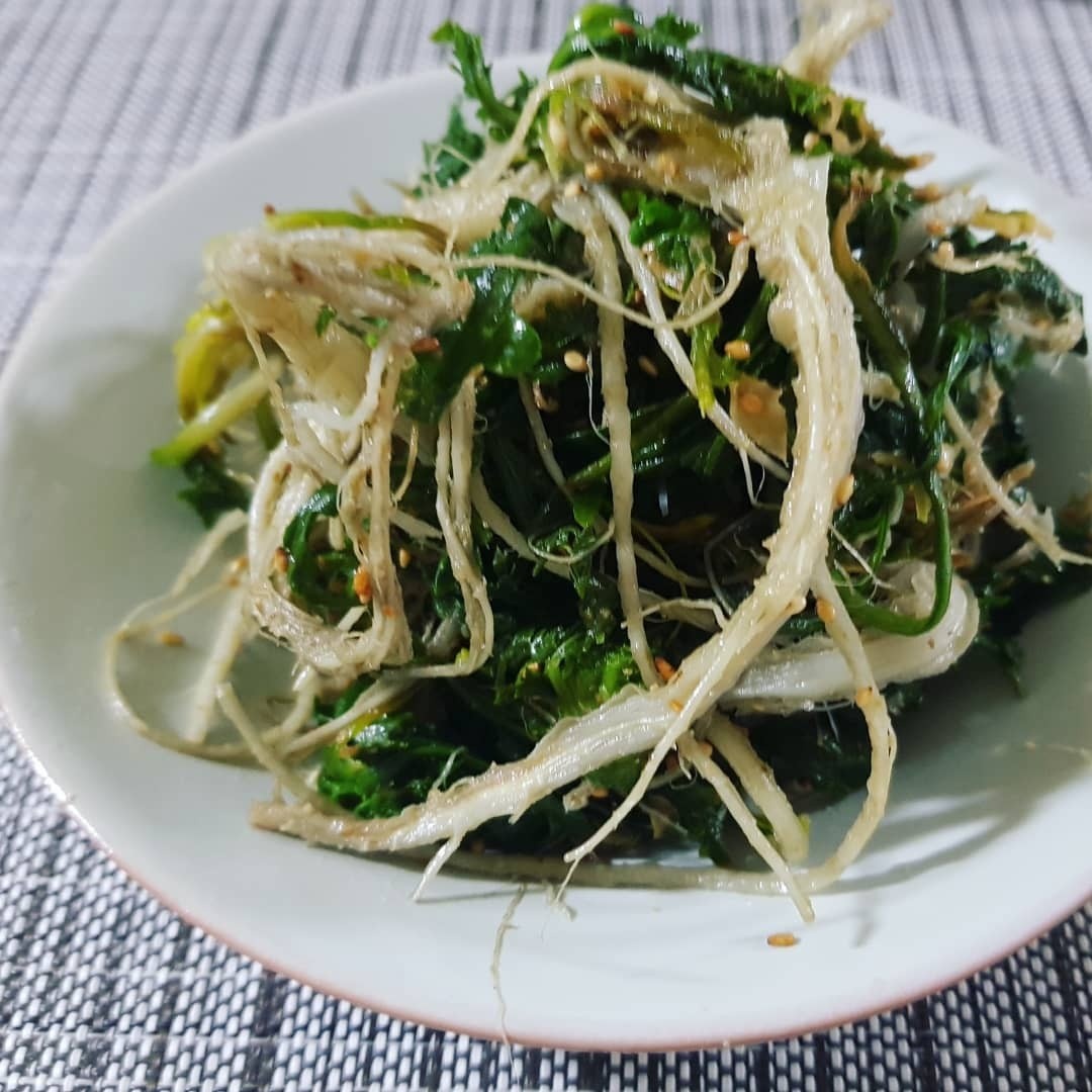 Now, add 1 tablespoon of sesame oil and a generous pinch of toasted sesame seeds. Gently mix the ingredients together with your hands, making a ‘crisp’ sound, until the seasoning is evenly distributed throughout the nettle. The nettle salad, with its harmony of fresh nettle aroma, savory sesame oil, and sesame seeds, is complete. It’s delicious right away, but letting it sit in the refrigerator for a while will allow the flavors to meld even more beautifully.