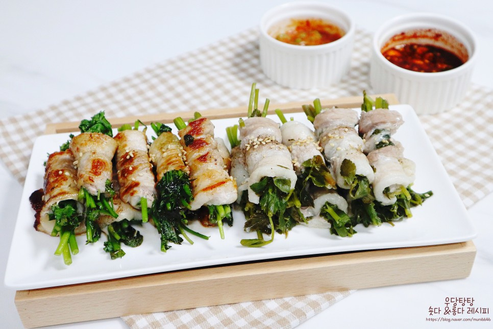 Steamed Rolls of Fresh Water Dropwort and Pork Belly: A Perfect Spring Dish with Dipping Sauces
