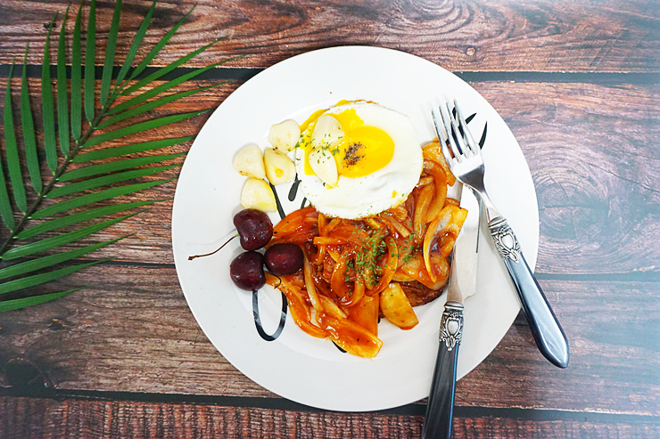 Now, let’s make the delicious steak sauce! In a bowl, combine 3 tablespoons of ketchup, 1 tablespoon of sugar, 1 tablespoon of soy sauce, and 1 tablespoon of vinegar. Add 1/2 cup of water (measured with a standard paper cup) and mix well. You’ll have a perfectly balanced sweet and tangy sauce.