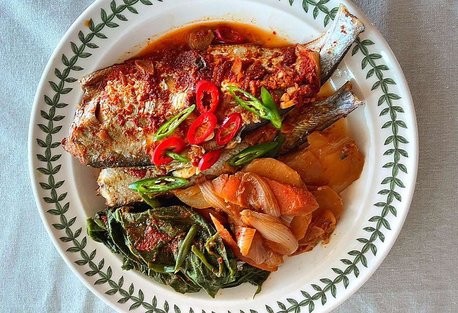 The saying ‘Even a rotten flounderer is still flounderer’ refers to how the fish retains its shape even after death due to its strong bones, or perhaps because of its delicious taste. It is indeed very bony, making it slightly inconvenient to eat. Fortunately, the small bones are soft, so if you carefully pick them out, they are less intimidating than tough ones. I previously bought a basket of flounderer, salted it for 1-2 hours, drained it on a sieve, and air-dried it for about a day until slightly firm before freezing. I used these frozen fish to make a braised dish. While radish is a classic pairing for braised fish, summer radishes aren’t always in season, and I didn’t have any at home. So, I opted for seasonal vegetables: potatoes, onions, and zucchini leaves, to make this flounder stew. Instead of making zucchini leaf wraps, we can wrap the flaky flounder meat with the braised zucchini leaves and dip them into the rich sauce – it’s heavenly! When you make fish stew, not only is the fish delicious, but the vegetables, thoroughly simmered in the flavorful sauce blended with the fish’s essence, are equally delightful. Enjoying the well-cooked potatoes or onions, or eating them with the zucchini leaves, feels like a perfect seasonal dish for summer. While I made this with flounder and zucchini leaves, you can certainly use the same sauce and ingredients with other types of fish and enjoy a similarly delicious braised dish.