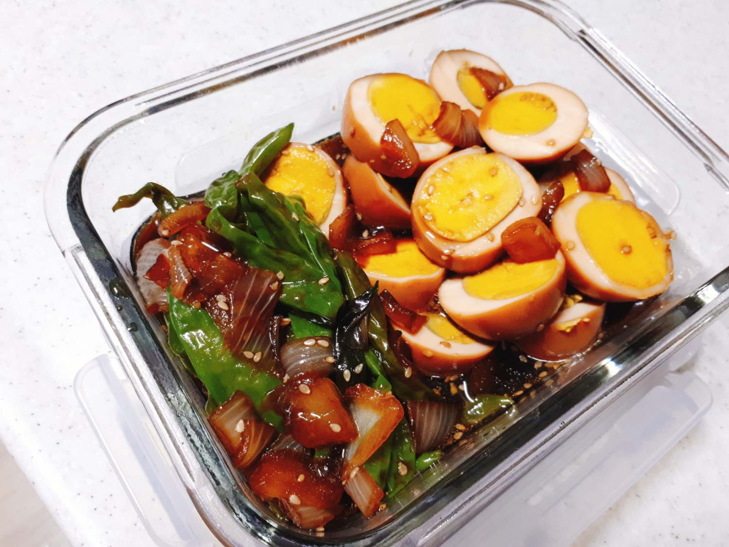 Finally, drizzle in a little sesame oil and sprinkle with toasted sesame seeds for added fragrance. Turn off the heat and let it cool slightly. Cut the baked eggs into bite-sized pieces and place them in a container. Pour the remaining braising sauce over the eggs. Your delicious braised baked eggs with shishito peppers are ready to be enjoyed with a warm bowl of rice!
