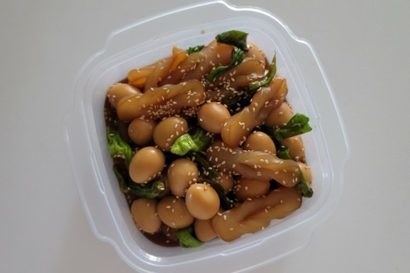 Prepare all your ingredients. Lightly rinse the peeled quail eggs under running water and drain them. Prepare the konjac into a convenient rectangular shape for use.
