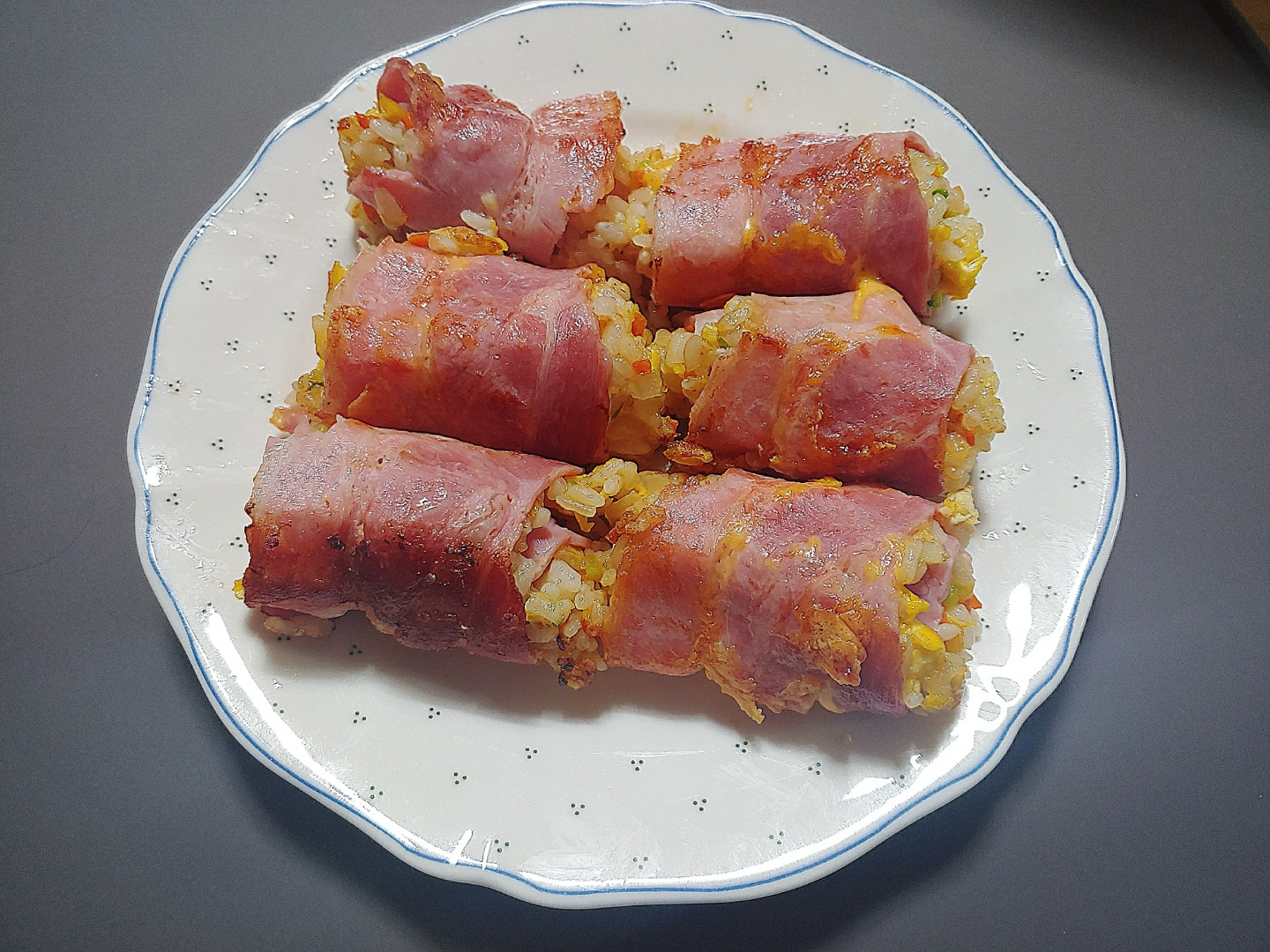 Spread the cooked fried rice onto a plate to cool slightly. Lay strips of bacon overlapping each other, then place the cut cheddar cheese on top. Spoon the fried rice mixture onto the cheese and bacon, and then carefully roll it up tightly, similar to making a sushi roll. Press firmly to ensure it holds its shape.