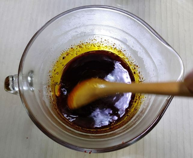 After pouring the hot oil over the chili powder, add 1 tablespoon of sesame oil. Then, gently stir with a spoon to ensure the chili powder and oil are well combined. It’s important to mix thoroughly so that the hot oil can sufficiently extract the spicy aroma and flavor from the chili powder.