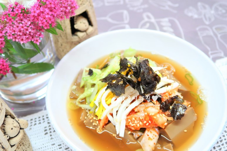 Arrange the sliced acorn jelly attractively in a serving bowl. Ladle the warm, savory anchovy broth generously over the jelly. Now, artfully arrange the prepared toppings: the sour kimchi, crisp cucumber strips, julienned egg garnish, and crumbled toasted seaweed. Finally, sprinkle with toasted sesame seeds and finely chopped scallions to complete your delicious creation. (If you prefer to eat it like a rice soup, have a bowl of hot cooked rice ready.)