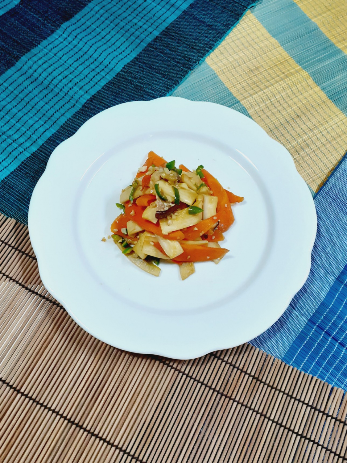 This stir-fry features a delightful harmony of tender, chewy king oyster mushrooms and crisp carrots. It’s a simple yet elegant side dish perfect for any meal. Enjoy this appealing stir-fry that makes a great accompaniment to rice or even a light snack with drinks!