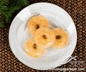 Remove the fried Umegi Tteok from the oil and gently pat off excess oil with a paper towel. Then, dip each piece into the prepared sweet persimmon syrup, coating both sides evenly. Finally, garnish with julienned dried jujubes and pumpkin seeds for a beautiful presentation. Your chewy and sweet Umegi Tteok, reminiscent of cherished memories, is now complete! It’s best enjoyed while still warm.