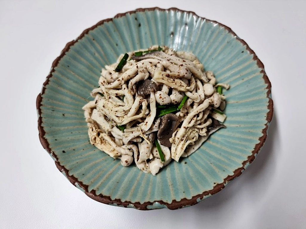 This finished mushroom salad boasts the rich, nutty flavor of perilla seeds combined with the mild, savory taste of the mushrooms, creating a clean and delightful side dish.