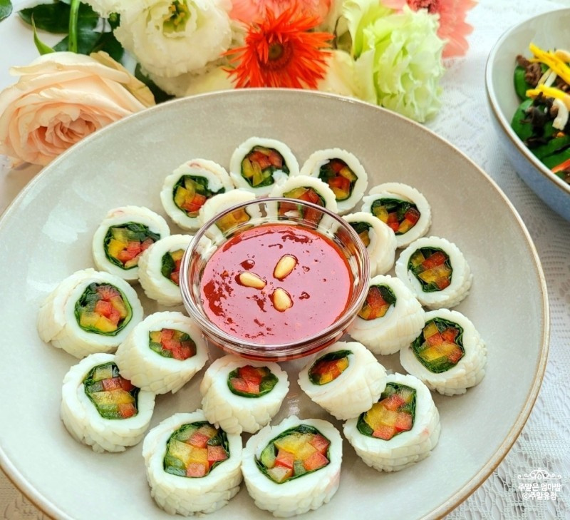 These ‘Squid and Vegetable Rolls’ are a delightful dish where chewy squid meets crisp vegetables, perfect for dipping in spicy, sweet, and sour gochujang sauce. The vibrant colors make it an excellent choice for entertaining guests! Enjoy the wonderful combination of squid’s chewiness and paprika’s crunch.