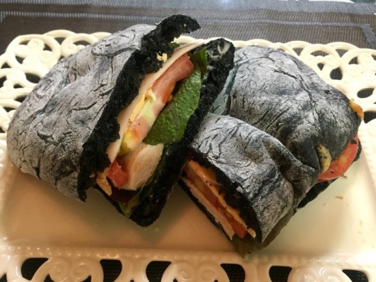 Spread the prepared sauce evenly on the inside of both halves of the ciabatta roll. (I used a squid ink ciabatta for health reasons this time, and the sauce made the color look quite interesting!)