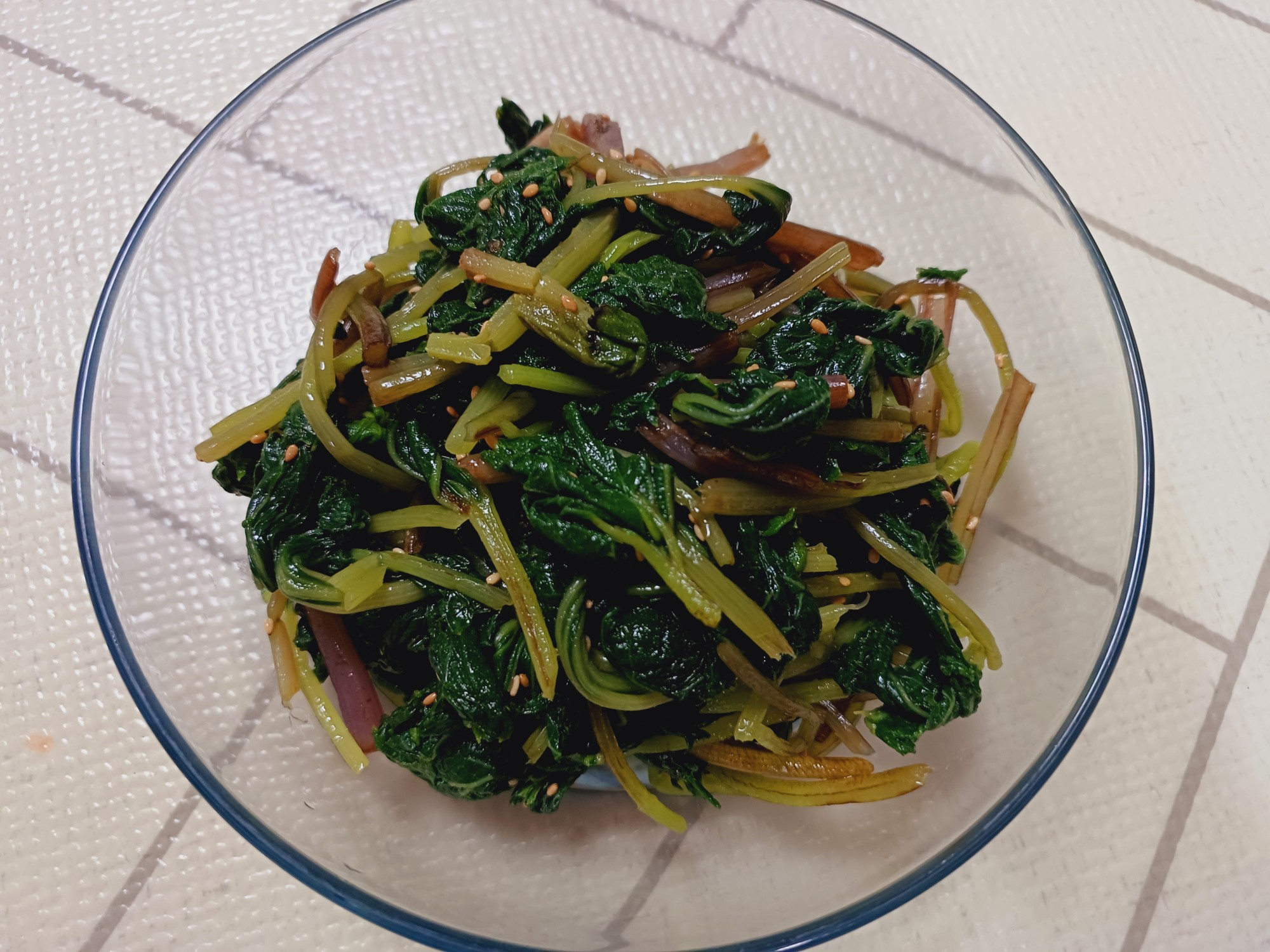 Immediately transfer the blanched Meowinamul to a bowl of cold water to cool down and remove the heat. Once cooled, gently squeeze out the excess water with your hands. Avoid squeezing too dry; leaving some moisture will help the seasoning adhere better.