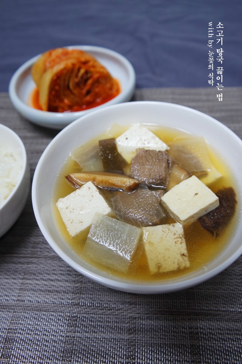 When the radish is almost tender, cut the tofu into small cubes (about 1.5cm thick) and add them to the pot. Cook for another 3 minutes. Finally, add the sliced kelp and let it simmer briefly. Your delicious Beef Tangguk is now ready! Enjoy it warm.