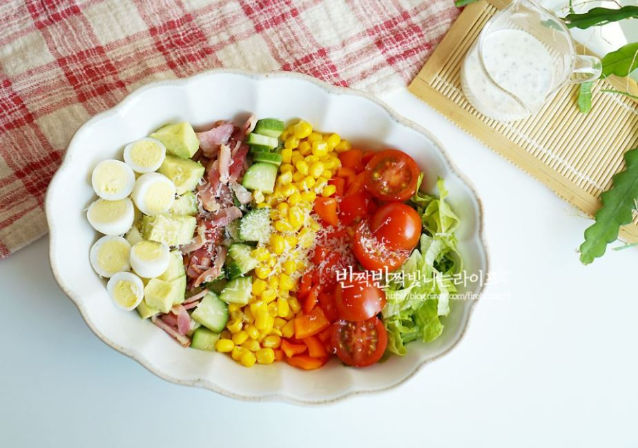 Arrange your salad on a large, flat plate or in a salad bowl. Start by creating a bed of chopped lettuce. Then, artfully arrange the chopped cucumber, avocado, halved cherry tomatoes, mini bell peppers, drained corn kernels, halved quail eggs, and crispy bacon. The key to a Cobb salad is to arrange ingredients in distinct sections or rows, rather than mixing them all together.