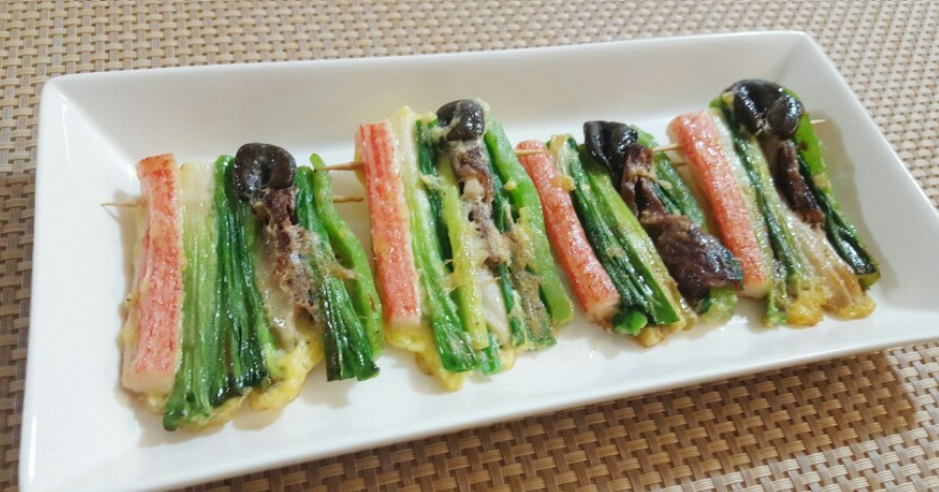 Now it’s time to assemble the skewers! Prepare toothpicks or small skewers. Thread the ingredients onto the skewers in the following order: imitation crab stick → scallion → minari → oyster mushroom → beef → scallion → green bell pepper. When skewering, slightly spread out the ingredients so they don’t overlap too much; this will help the jeon maintain its shape and look more appetizing when cooked. (Tip: You can change the order of ingredients as you like, and feel free to add more of your favorite ingredients. For example, adding bell peppers of different colors can enhance the visual appeal.)