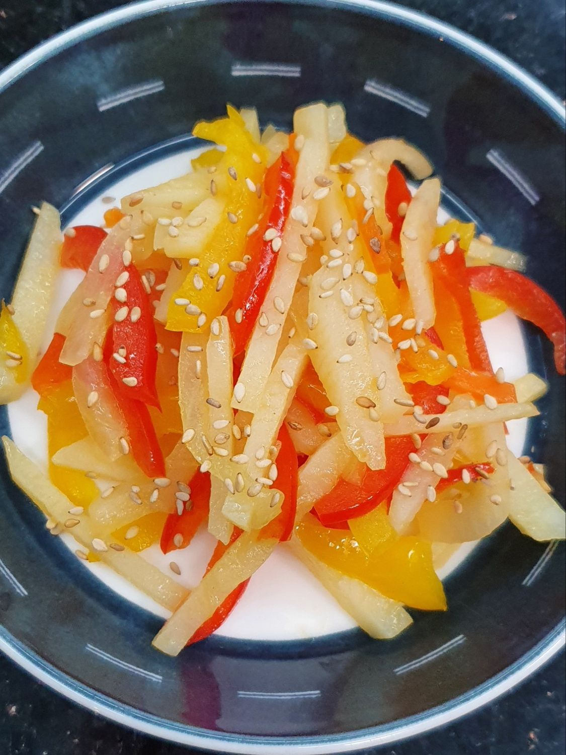 Transfer the finished potato and vegetable stir-fry to a nice serving plate. Finish by sprinkling some sesame seeds on top. How about serving this ‘Colorful Potato and Vegetable Stir-Fry’ as a delightful side dish for your child today? 😊