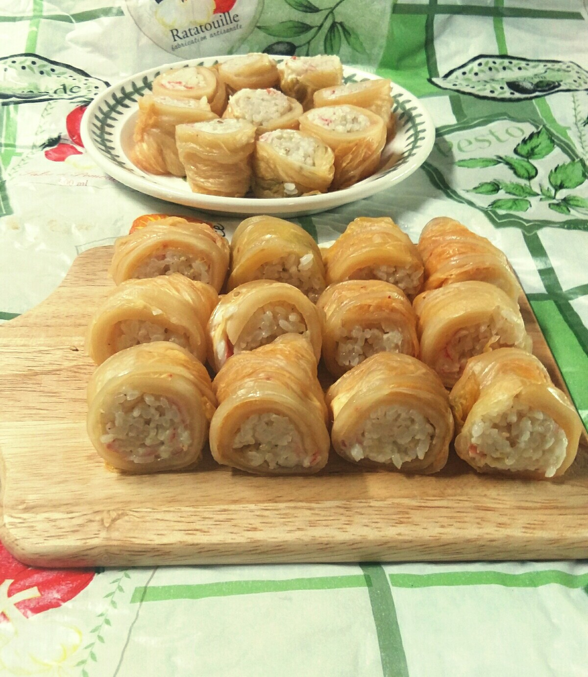 Place a ball of the seasoned rice and a portion of the seasoned crab stick mixture onto the stem-end of a prepared kimchi leaf. Arrange them so they are easy to wrap with the wider part of the kimchi leaf.
