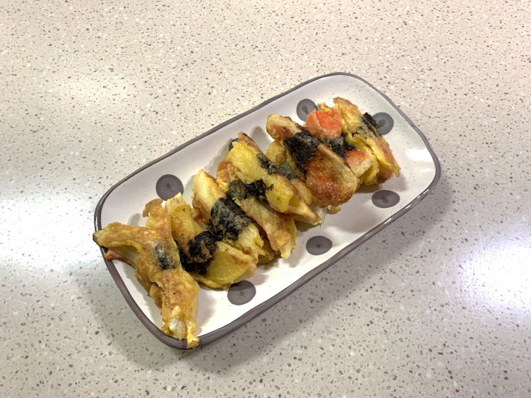 You’ve now completed rolling all the crab stick and pickled radish fillings in seaweed. The next step is to coat these rolls in pancake batter and egg wash before pan-frying them to a golden brown. Handle them gently to maintain their shape.