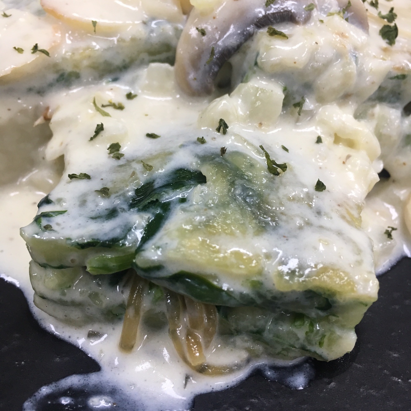 Carefully place the japchae-filled chive pancakes onto the prepared cream sauce in the pan. Gently press down to ensure the sauce coats the pancakes evenly. For an extra touch of color and flavor, sprinkle with dried parsley flakes. Your delicious ‘Cream Chive Pancake with Japchae Filling’ is now ready to be served!
