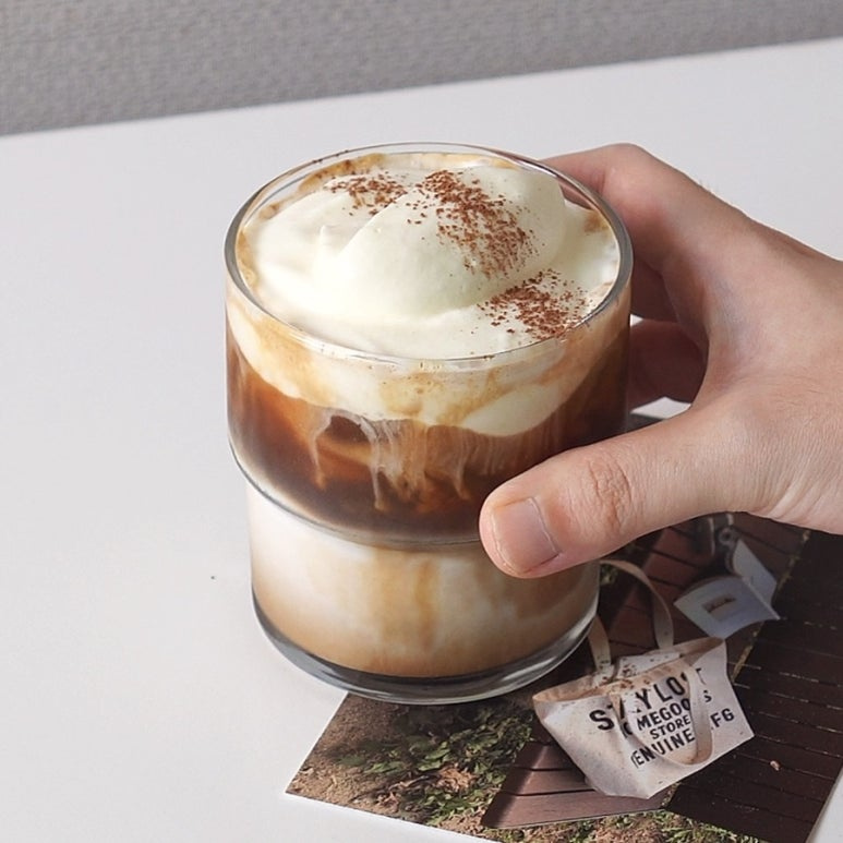 To create a beautiful presentation, gently spoon another dollop of cream onto the top, shaping it slightly to stand tall, like a soft mountain. This enhances the visual appeal of the layered latte.