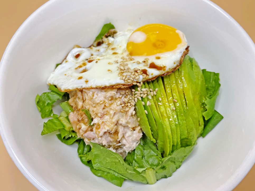 In a nice serving bowl, place 1 bowl of warm rice first. Arrange 3 washed and dried lettuce leaves attractively on top. Then, layer the sliced avocado, the prepared tuna mayo, and the fried egg in order. Finally, drizzle the prepared sauce all around and sprinkle with sesame seeds. Your visually appealing and incredibly delicious Avocado Tuna Mayo Rice Bowl is ready! Enjoy your meal.