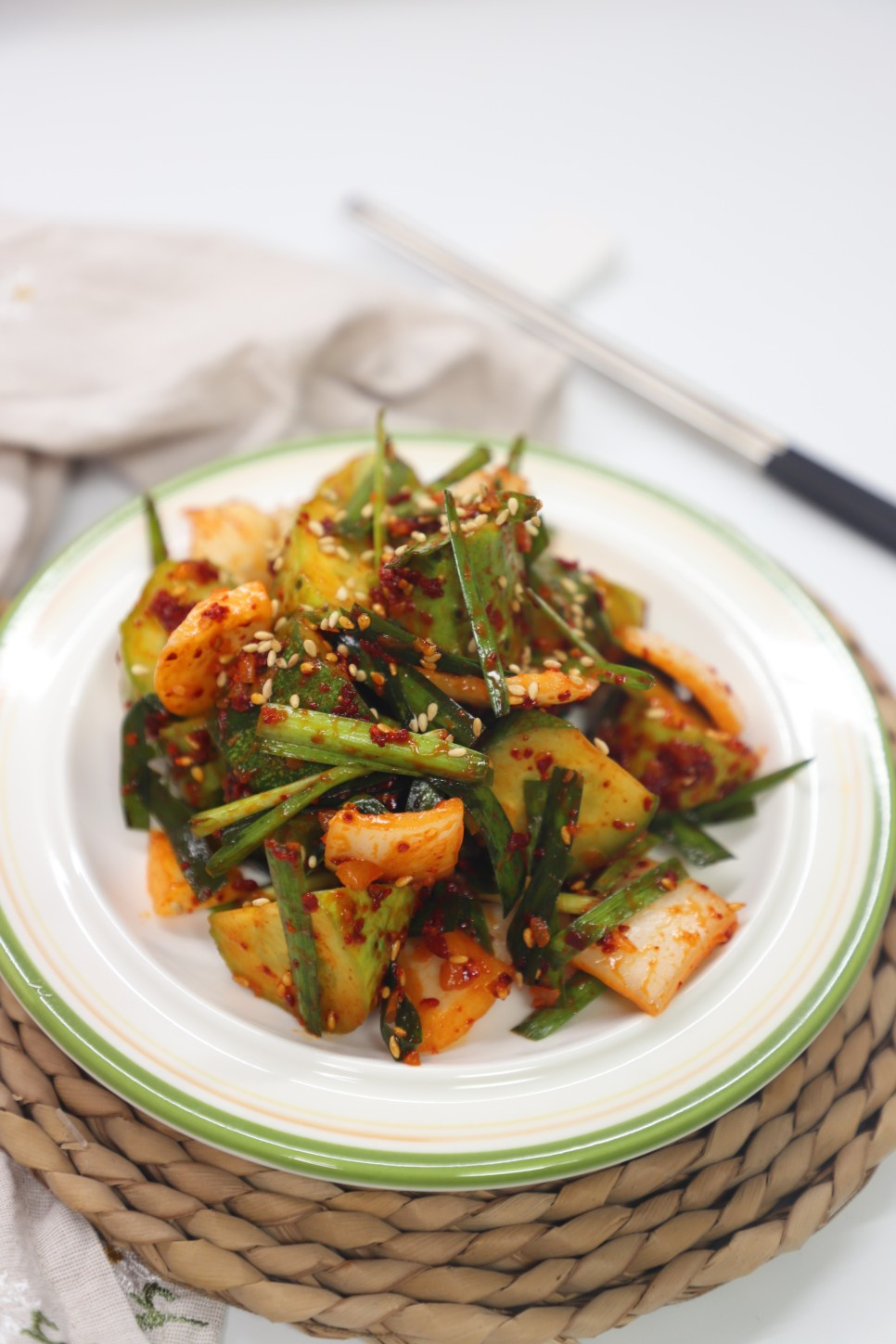 Combine the sliced cucumber, onion, and chives in a bowl. Add the dressing ingredients: 1 Tbsp Gochujang, 4 tsp Gochugaru, 2 tsp Sugar, 1/2 Tbsp minced garlic, 1 Tbsp sesame oil, 2 pinches of salt, and 1 Tbsp sesame seeds.