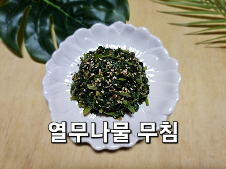 Your crisp and refreshing young radish greens salad (Yeolmu Namul Muchim) is ready! Enjoy a delicious meal with this freshly made spring side dish.