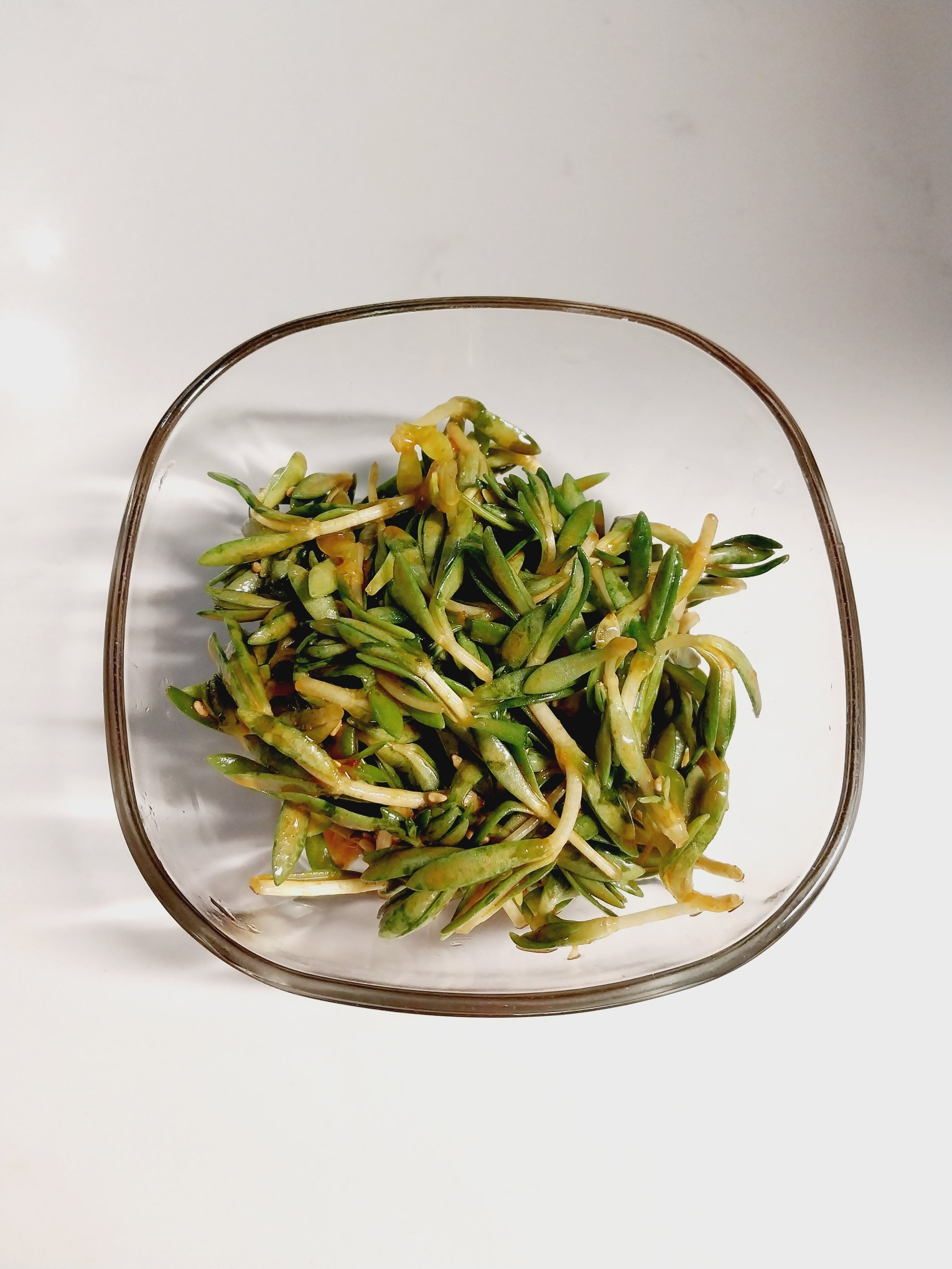 After soaking in the vinegar water for 30 minutes, rinse the stone crop again under cold water. Drain it very well in a colander; excess water will dilute the dressing. Once drained, add 6 Tbsp of cho-gochujang to the stone crop. Gently toss to coat evenly. Be careful not to mix too vigorously, as this can bruise the delicate greens.