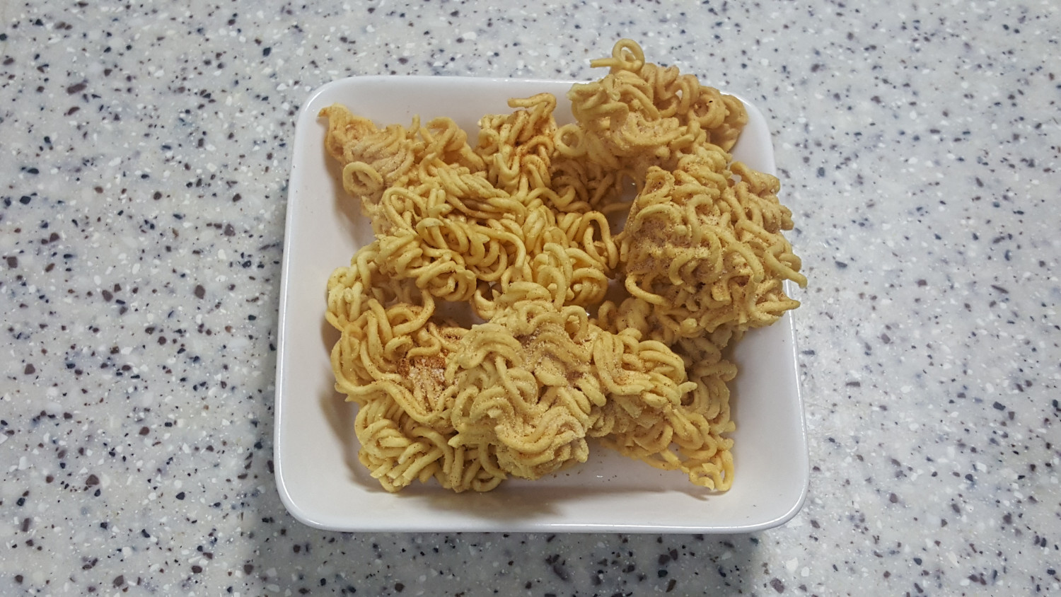After 5 minutes, carefully remove the ramyeon and flip it over. This ensures that both sides become evenly crispy.