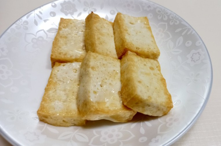 Cut the tofu into bite-sized pieces or your desired thickness. Slicing them about 1.5cm to 2cm thick is recommended to prevent them from breaking apart too easily.