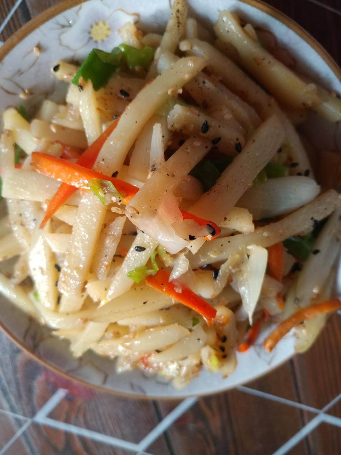 Heat 1 Tbsp of cooking oil in a pan over medium-high heat. Add the drained potatoes. Using a glove, gently toss the potatoes with your hands to coat them evenly with oil. This prevents them from sticking to the pan and ensures even cooking. Stir-fry the potatoes over high heat. Once they start to become tender and slightly translucent, add the sliced onion and chopped Korean chili peppers. Continue to stir-fry. Season with a pinch of black pepper for enhanced flavor. (Optional) You can add a pinch of Dashida for extra umami, but the potatoes are delicious even without it! Finally, turn off the heat and generously sprinkle with sesame seeds. Your delicious, perfectly textured pan-fried potatoes are now ready to be enjoyed. Serve hot with rice!