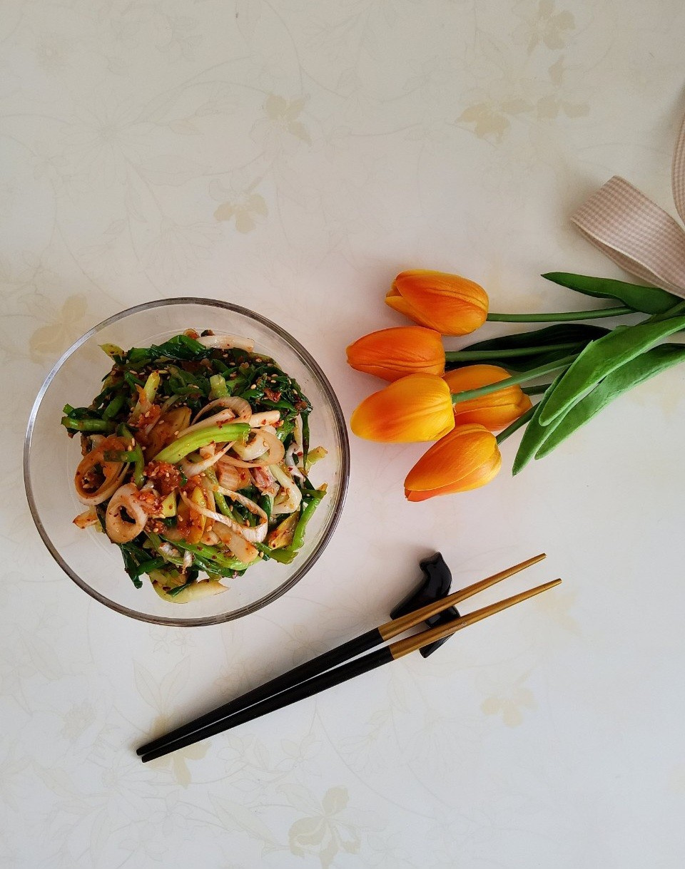 The dish I’m introducing today is a crispy and delicious scallion salad. You can make a wonderful side dish with simple ingredients.
