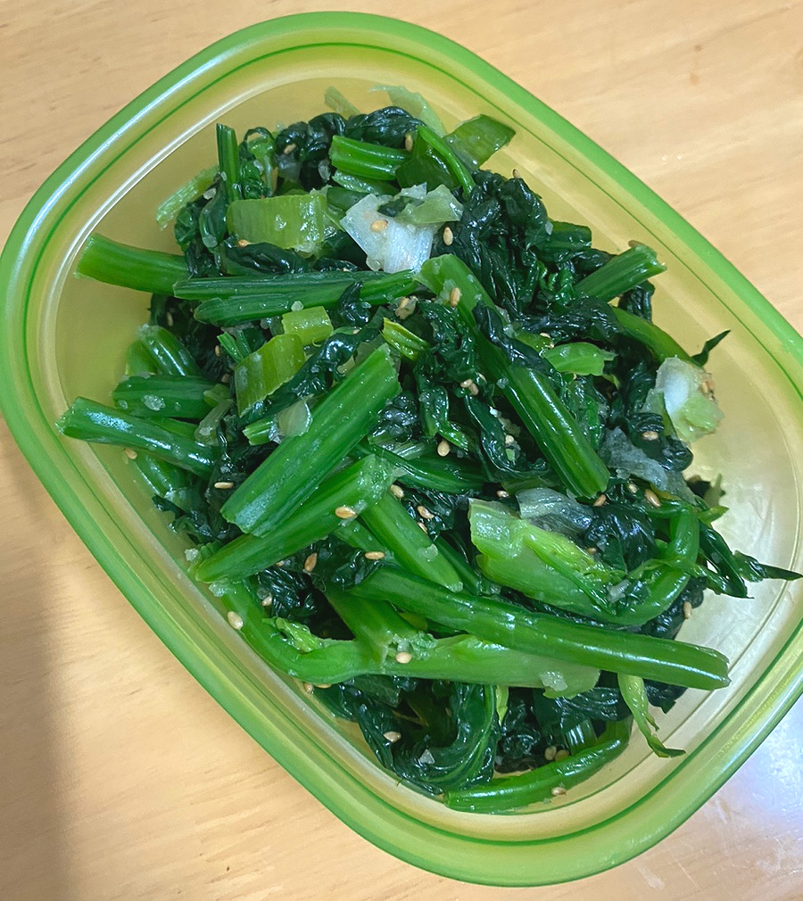 Spinach, a bunch of it, is perfect for consuming within a day or two, so you don’t have to worry too much about it going bad! If you’re living alone and have leftover spinach, it’s great for applications like bibimbap, fried rice, or rice balls! I’ll share a delicious seasoned spinach recipe with you.