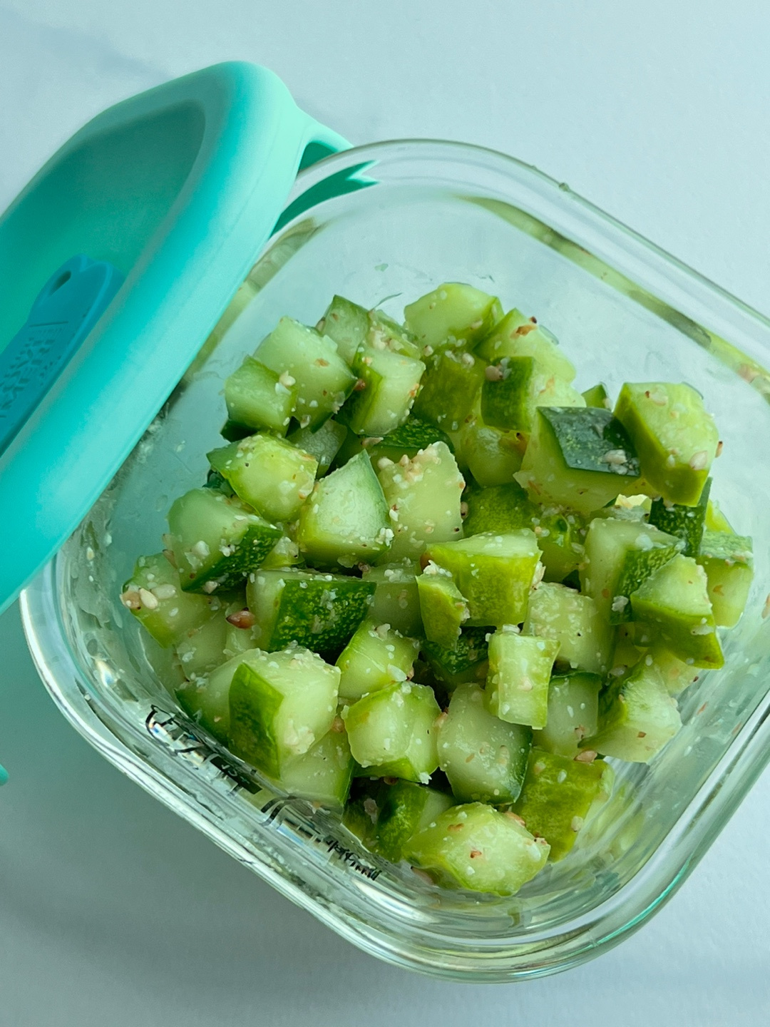 Add 1/2 teaspoon of baby salt (or a very small amount of regular salt) to the diced cucumbers and gently toss to combine. Let the cucumbers sit for about 15 minutes to draw out excess moisture. Afterward, drain any liquid that has accumulated. This process helps the cucumbers retain their crispness.